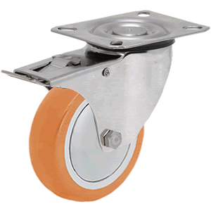 INFORMAÇÃO DO PRODUTO Rodízio giratório, com travão(bloqueio simultâneo), com duas pistas de esferas, suporte em aço estampado, zincado brilhante.